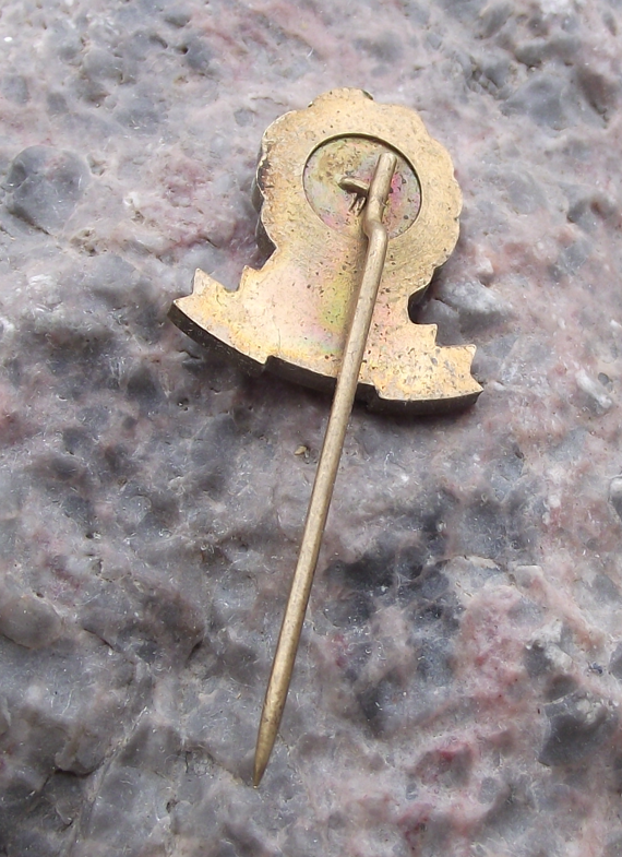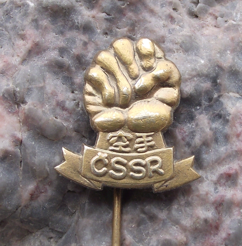 - A gold coloured, metal badge 2.1cm high with a long, stick pin style fastener to the rear. Featuring the text Karate, in Japanese and the initials CSSR with a closed fist motif.