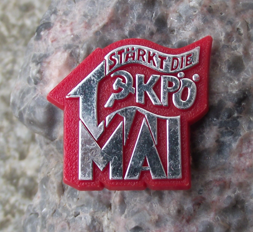 - This is a rare red coloured plastic badge from the Austrian May Day celebrations. Featuring the silver text 'KPO STRENGTH MAY 1st'.