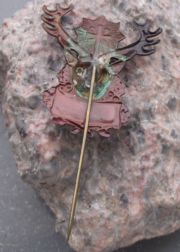 - A vintage gold coloured metal hunting themed pin from Krkonose forest in Czechoslovakia, the badge face is 5cm high and has a safety clasp style fastener to the rear. Featuring the holy stag that appeared to St Hubert.