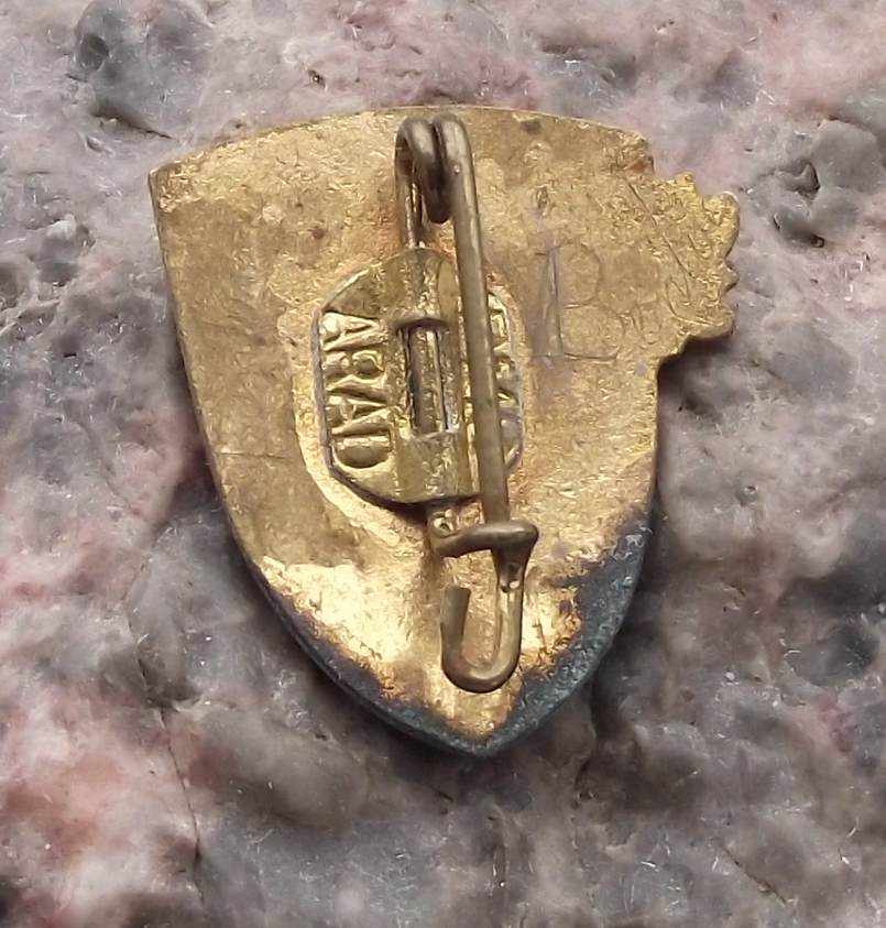 - A very pretty, vintage Romanian, gold coloured metal pin badge from Red Lake ( Acul Rosu )