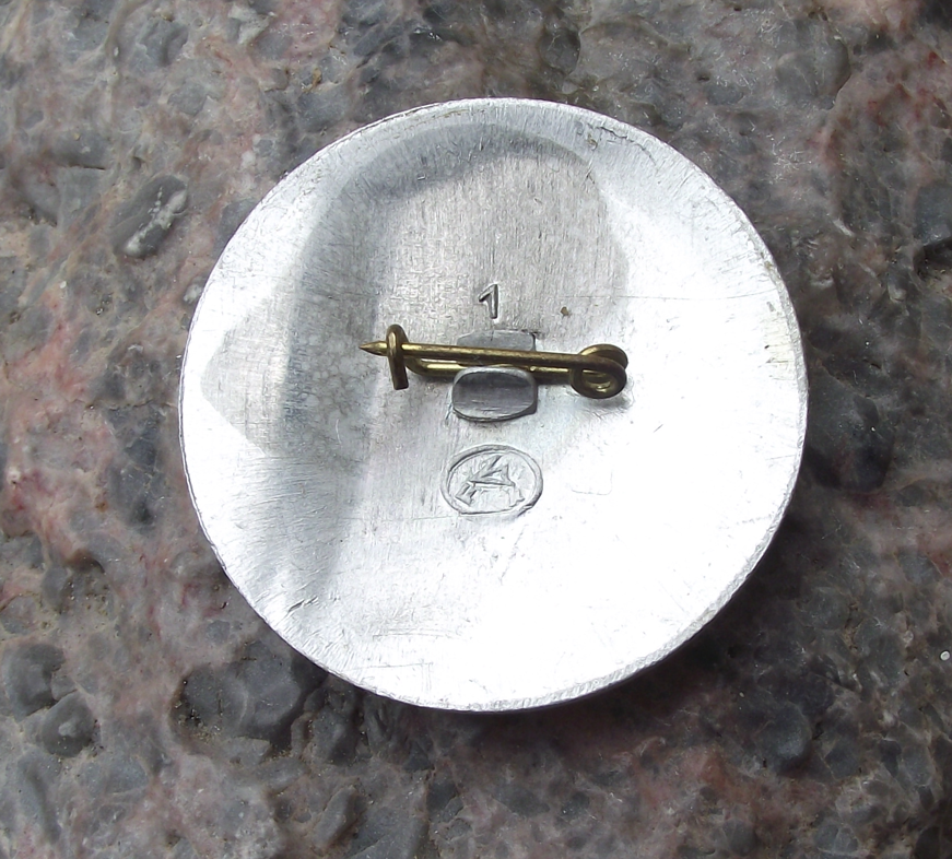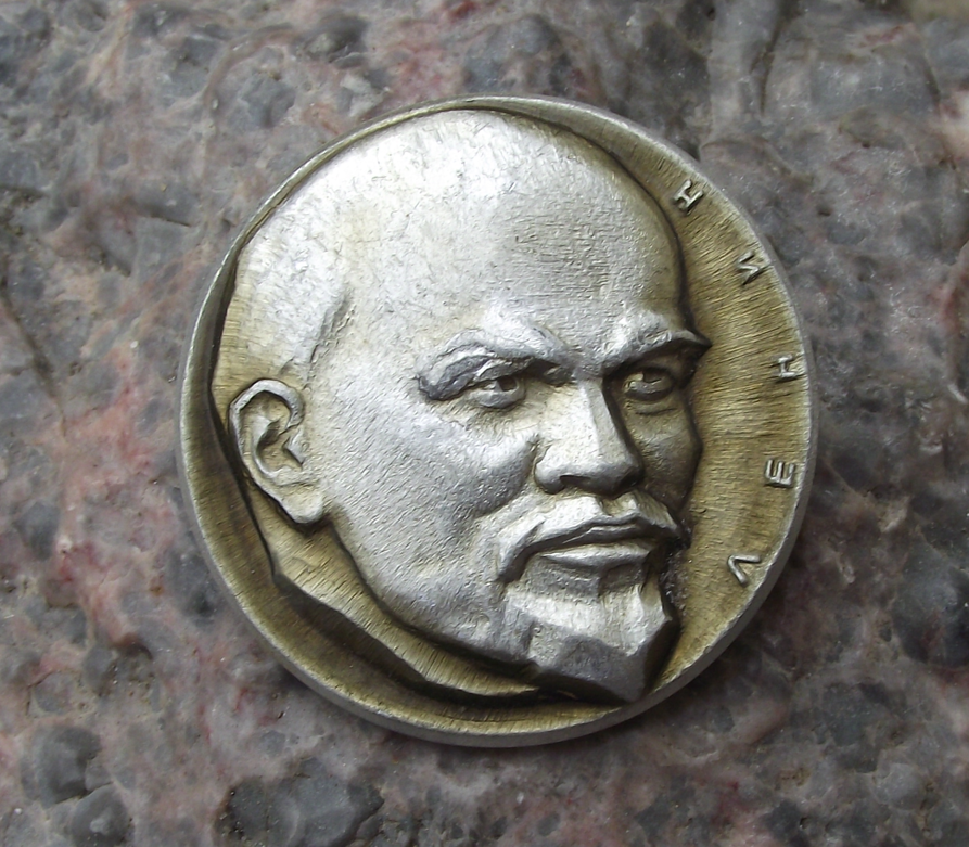 - A Lenin pin badge, 3.3cm wide, made of a silver coloured metal and featuring Lenin's head.