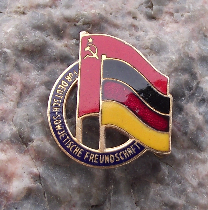This badge represents the strong ties between the Soviet Union and the German Democratic Republic. Depicting their friendship as the two national flags flying side by side and is from the Society for German - Soviet Friendship