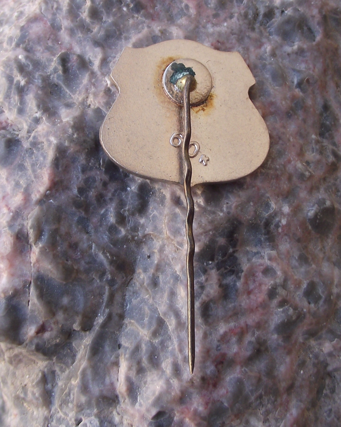 The badge face is 2.5cm wide and has a long, stick pin style fastener to the rear.