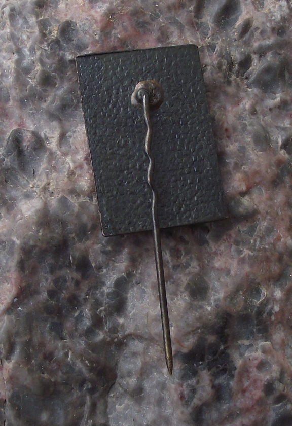 - A bronze coloured metal badge with a 2.2cm high badge face and a long stick pin style fastener to the rear.