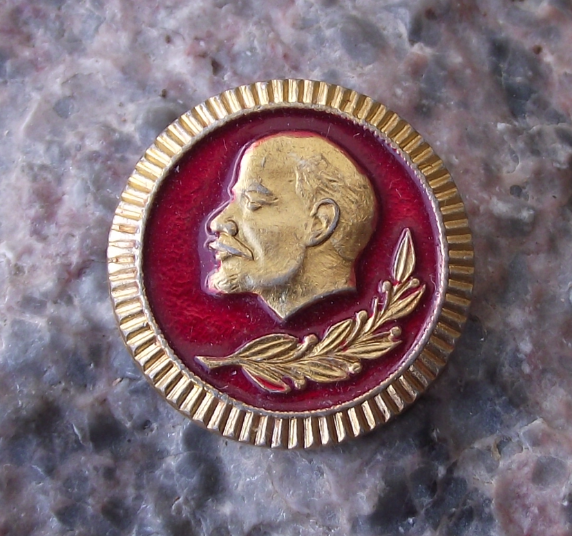 - A pretty, Lenin pin badge, with a 2.2cm wide badge face, made of a gold coloured metal and featuring Lenin's head above a laurel leaf branch, with a safety clasp style fastener to the rear.