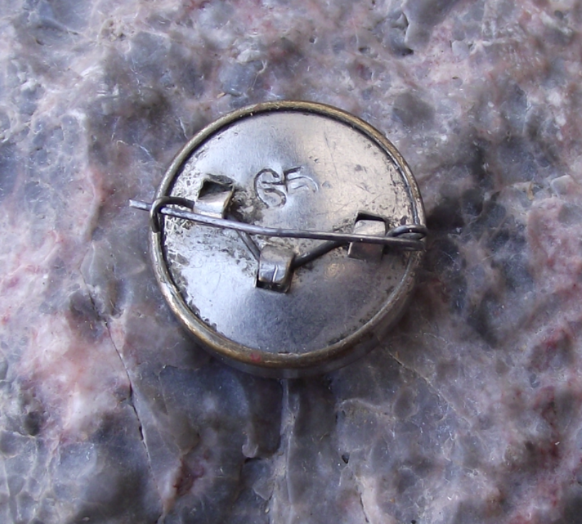 - A silver coloured, metal badge 1.8cm in diameter with a safety clasp style fastener to the rear.