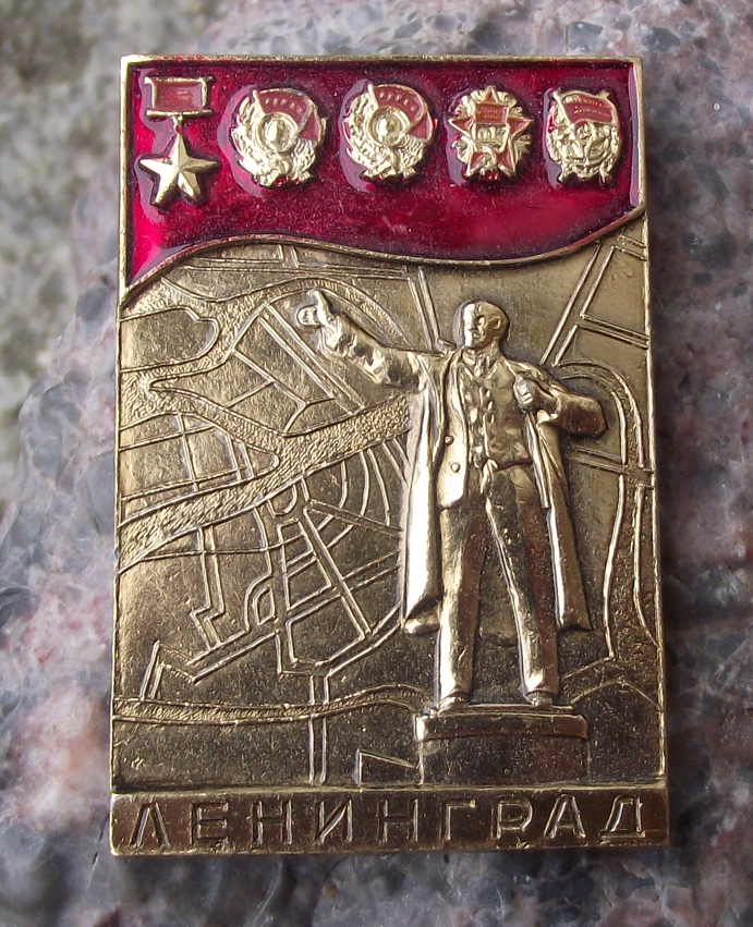 - A large Lenin pin badge, 4.5cm high, made of a gold coloured metal with a safety clasp style fastener and featuring the statue of Lenin that still stands at Finland Station in modern day St Petersburg.