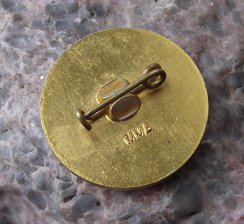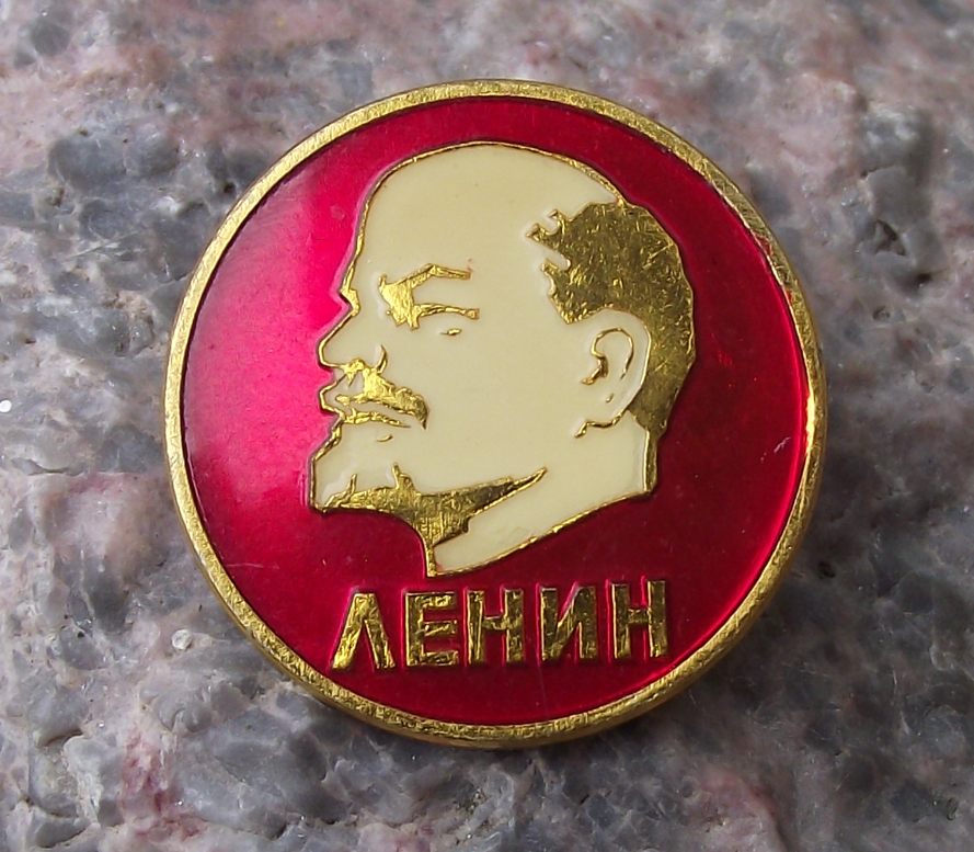 - A Lenin pin badge, 2.2cm in diameter, made of a gold coloured metal and featuring Lenin's head on a red circle.