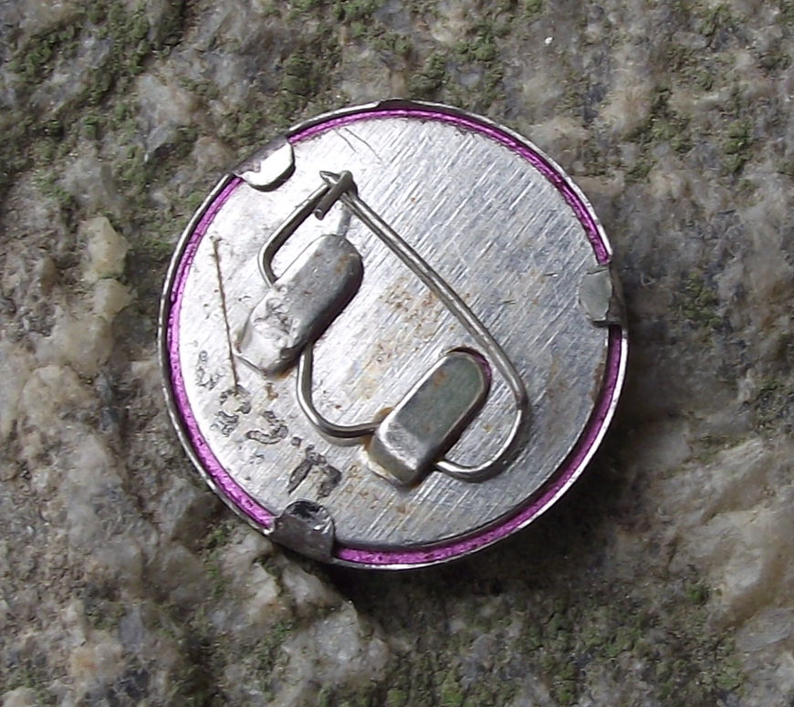 - This badge is 1.6cm in diameter and made from a silver coloured metal with a safety clasp style fastener to the rear and a plastic face.