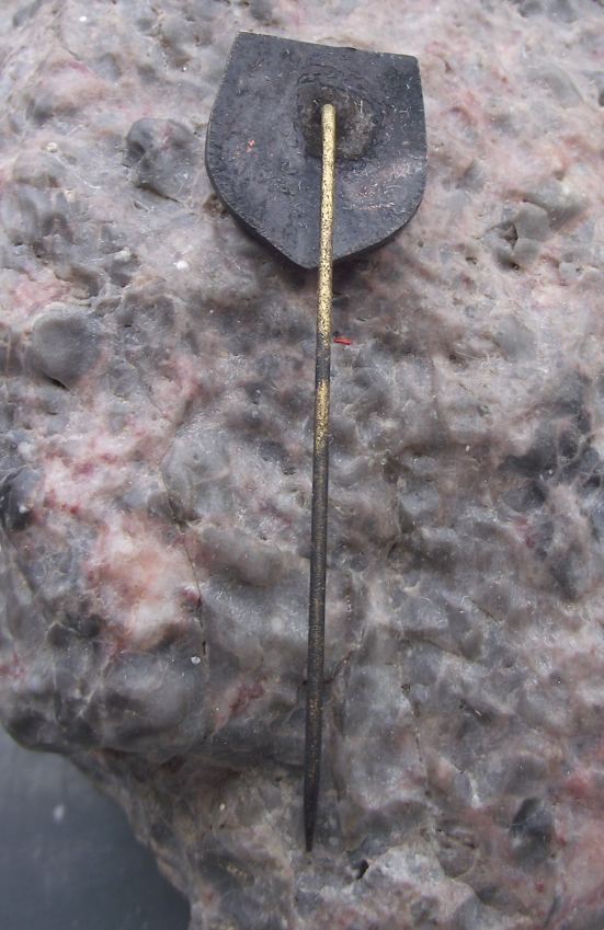 The badge face is 1.8cm high and has a long, stick pin style fastener to the rear.