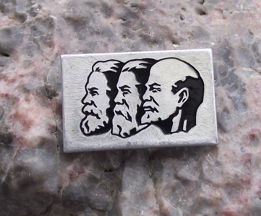 - A pretty pin badge, 2.1cm in diameter, made of a silver coloured metal and featuring Karl Marx, Friedrich Engels and Vladimir Lenin . With a safety clasp style fastener to the rear.
