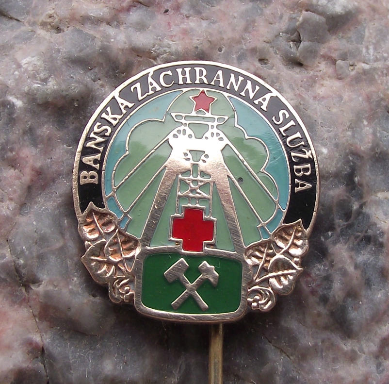 - A pretty, vintage pin from former Czechoslovakia. The badge face is 2cm high and has a stick pin fastener to the rear. It features the text Báňská záchranná služba and features the old logo of a mining tower and red cross.