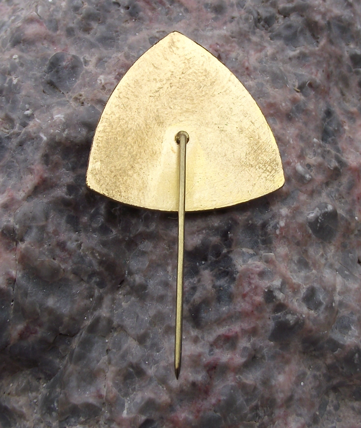A vintage gold coloured metal hunting themed pin from former Czechoslovakia, it is 2.5cm high and has a long stick pin style fastener to the rear. Featuring the text 'STATNI LESY SEVEROMORAVSKE', it would have been worn by members of this forestry management team.