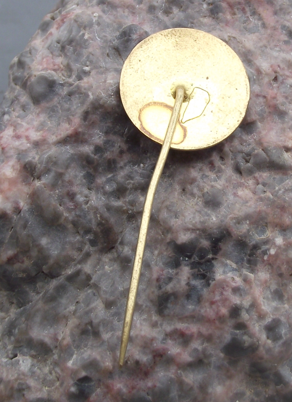 - A gold coloured, metal badge 2cm in diameter with a long, stick pin style fastener to the rear. Featuring the text NO AIDS !