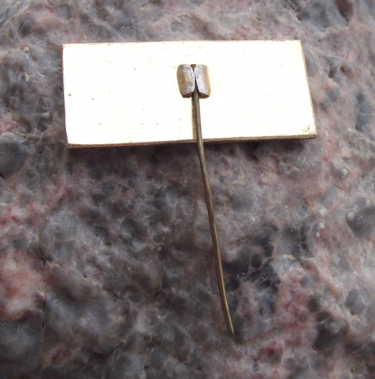 - A silver coloured metal badge with a 3.1cm wide badge face and a long stick pin style fastener to the rear. The badge features a racing cyclist with the text 조선 meaning KOREA (The Northern One)