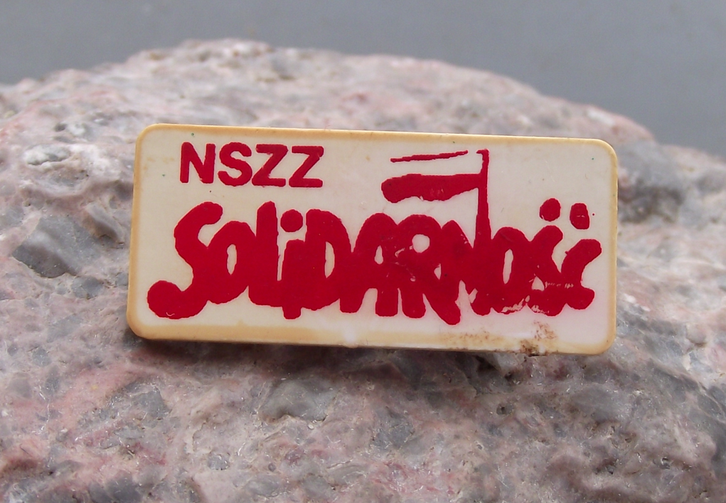 - A white coloured, plastic badge 3cm wide with a pin fastener to the rear (these pins were made by members as the organisation was illegal up until 1980). Made for members of the Solidarity trade union at the Gdansk Shipyard, the birthplace of the Polish Solidarity movement.