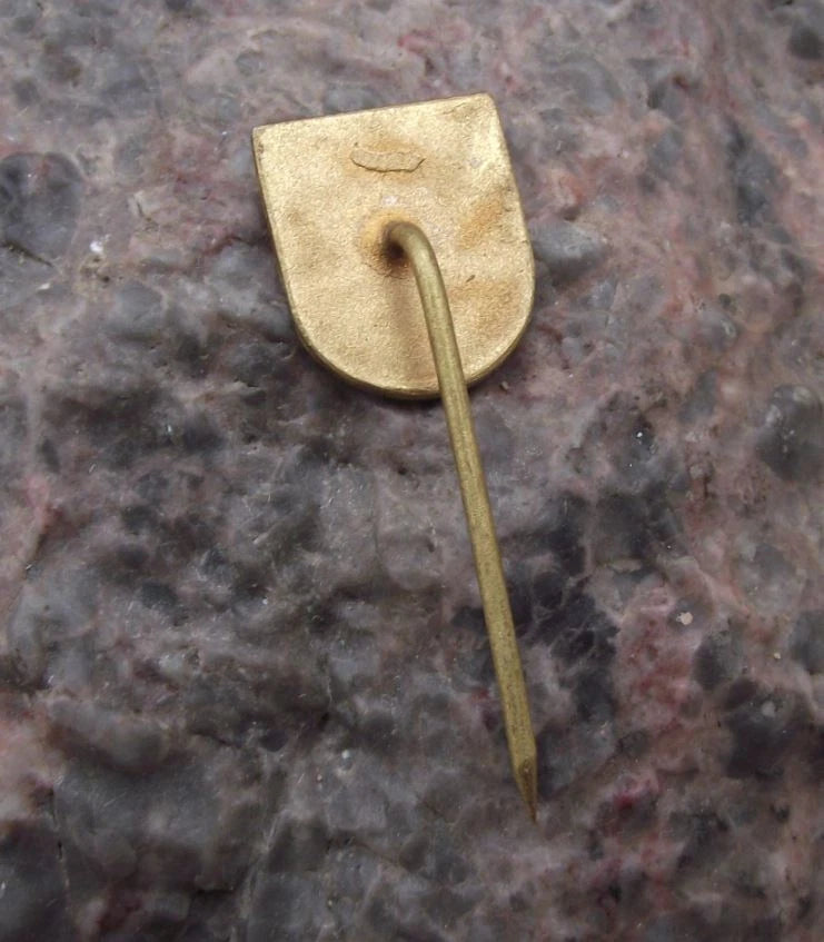 The badge is made of a gold coloured metal. The badge face is 1.5cm high with a long stick pin fastener to the rear.