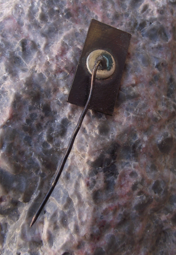 - A bronze coloured metal badge with a 2.2cm high badge face and a long stick pin style fastener to the rear.