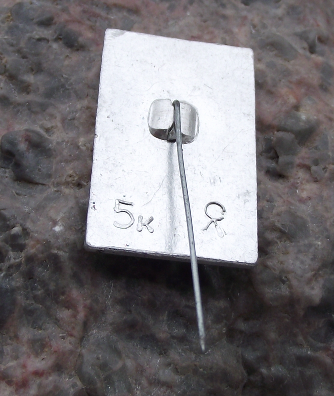 - A silver coloured metal badge with a 2.5cm high badge face and a long stick pin style fastener to the rear.