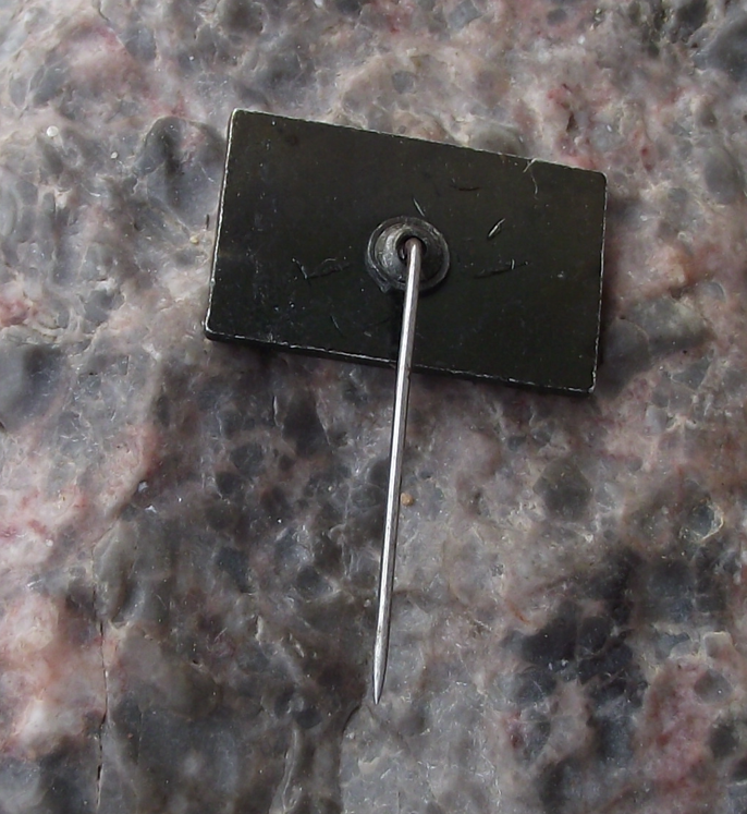 - A silver coloured metal badge with a 2.1cm wide face and a long stick pin style fastener to the rear.