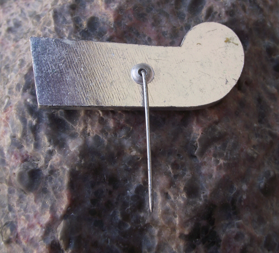 - A silver coloured metal badge with a 4.2cm wide face and a long stick pin style fastener to the rear.