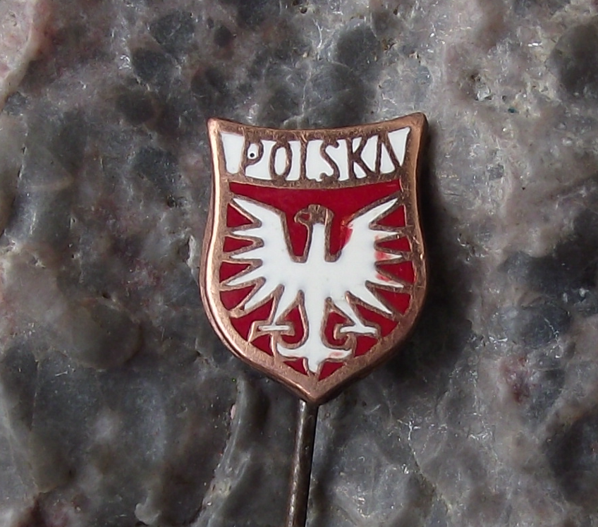 - A very small, but pretty, vintage Polish pin badge. It is made from a copper coloured metal. The badge face is 1.3cm high and has a short, stick pin fastener to the rear.