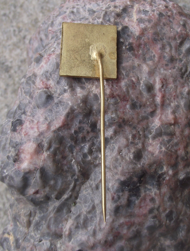 - The badge face is 1.6cm wide, made of a gold coloured metal and has a long, stick pin style fastener.