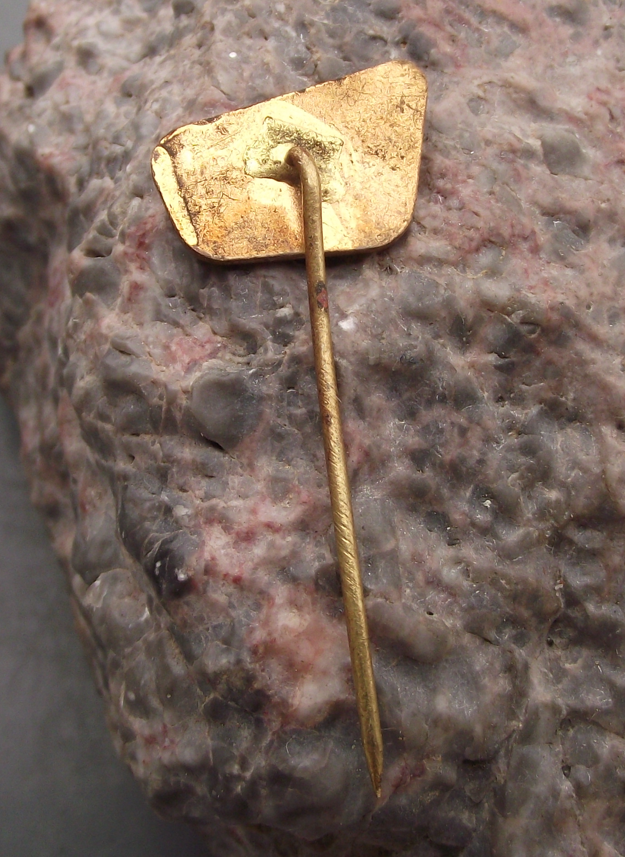 A pretty vintage pin badge from the Železniční stavitelství Brno. The badge face is 1.8cm wide, made from a gold coloured metal and has a stick pin fastener to the rear.