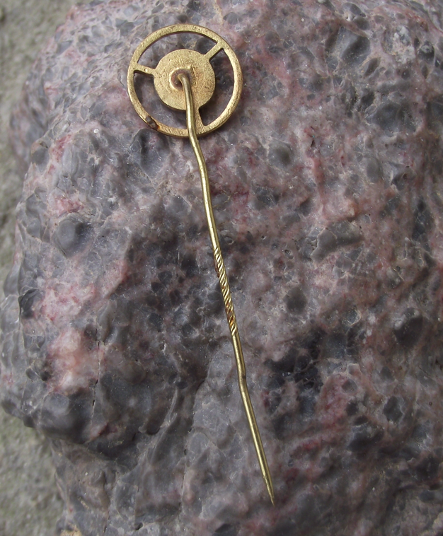 The badge face is 1.5cm wide and has a long, stick pin fastener.