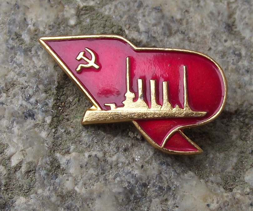 The badge face features the flag of the Soviet Union and the cruiser 'Aurora'