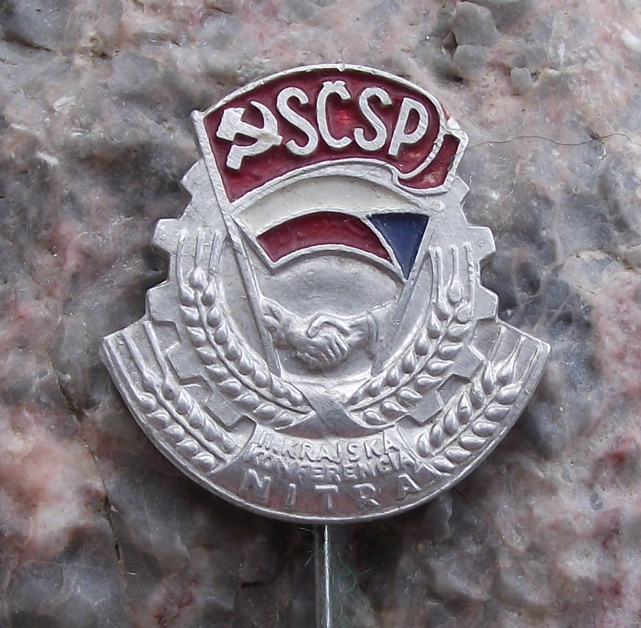 - A silver coloured metal pin badge made in the 1950's to mark the 2nd conference (sjezd) of the SCSP which is the Svaz ceskoslovensko-sovetskeho pratelstvi or the Russian Czech Union of Friendship, held in the Slovak city of Nitra. The badge face is 2.5cm high and has a long, stick pin style fastener on the rear side.