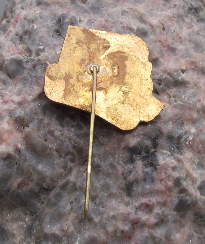 - The badge face is 2.6cm in diameter and has a long stick pin style fastener to the rear.