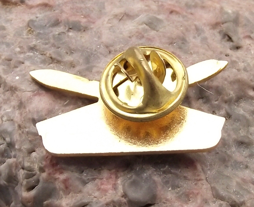 A gold coloured metal badge with a 3cm wide face and a modern butterfly clasp style pin fastener to the rear.