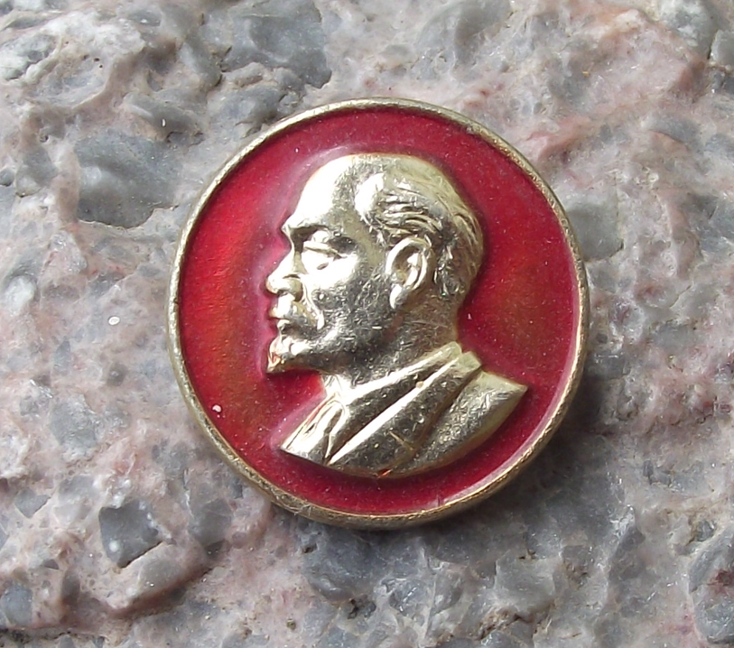 - A pretty, Lenin pin badge, 1.5cm in diameter, made of a gold coloured metal and featuring a superbly detailed golden Lenin. With a safety clasp style fastener to the rear. (some have a stick pin).