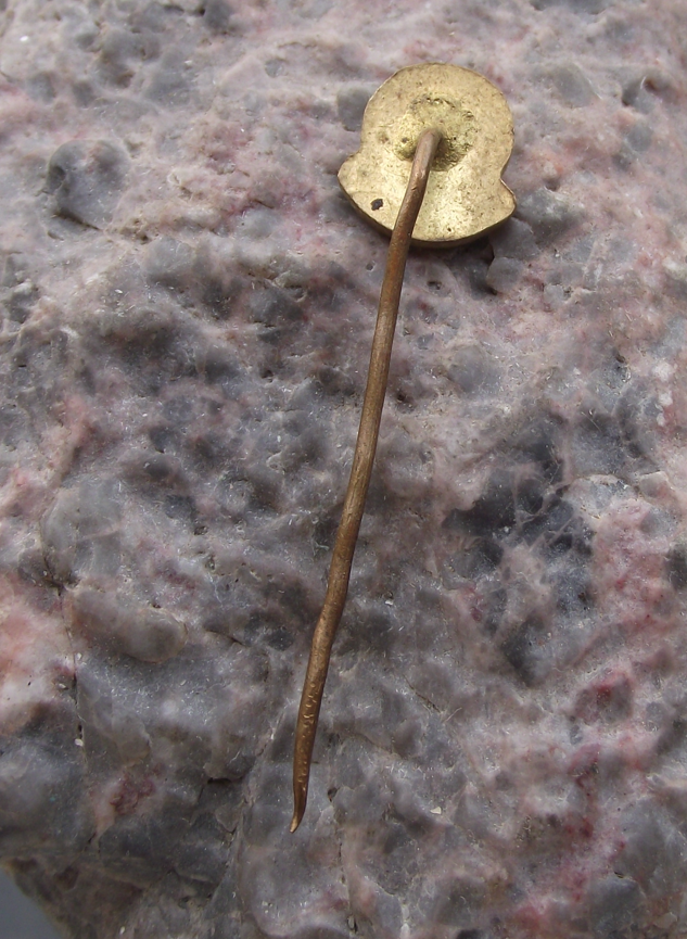 The badge face is 1.1cm high and has a long, stick pin fastener.