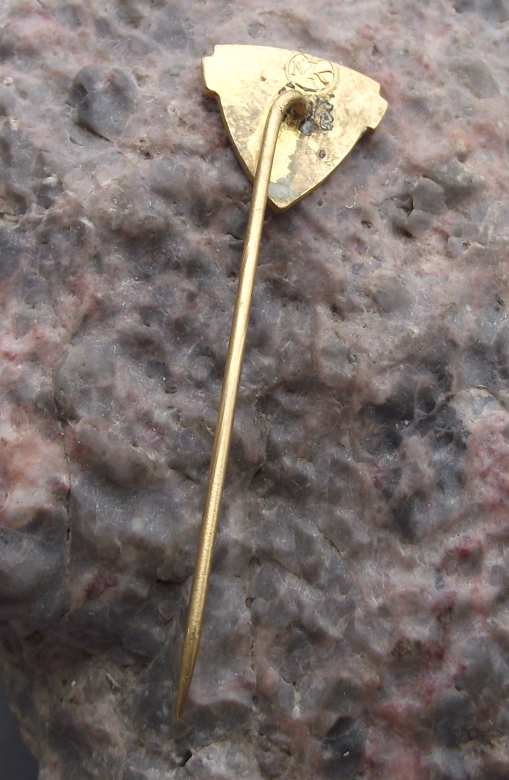 A vintage 1960's gold coloured metal pin badge featuring the Tatran logo. The badge face is 1.6cm high and has a long stick pin style fastener to the rear.
