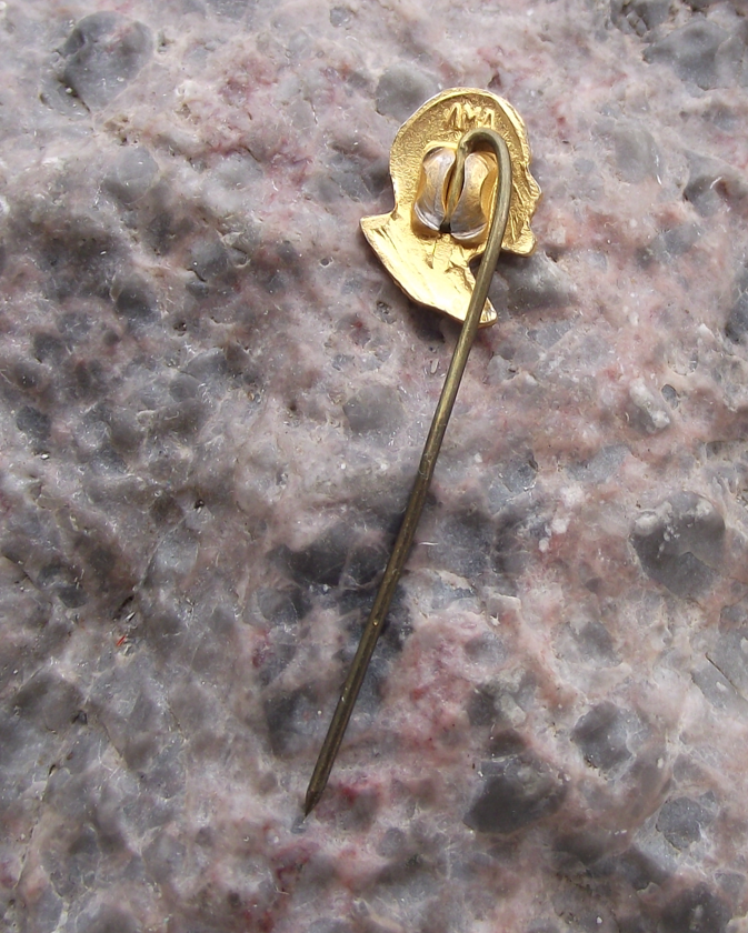 - A gold coloured, metal badge 1.3cm high with a long stick pin style fastener to the rear.