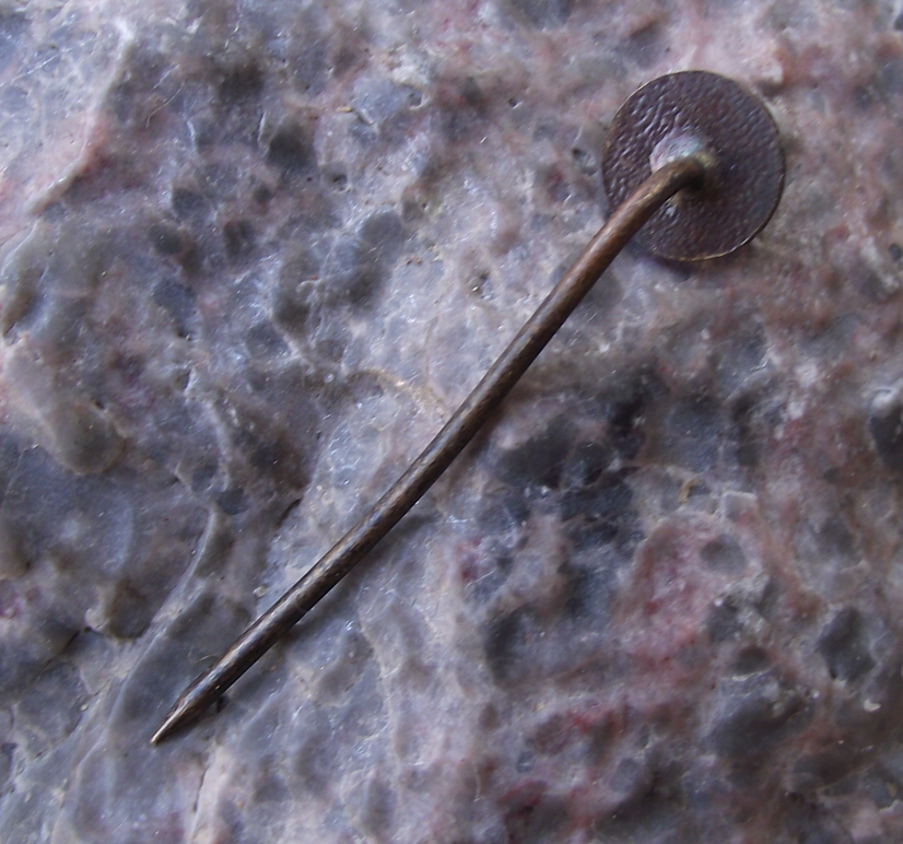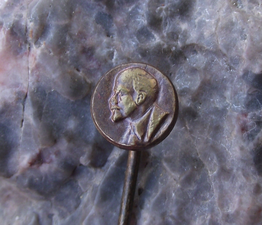 - A pretty, small Lenin pin badge, with a 0.8cm diameter badge face, made of a gold coloured metal and featuring Lenin's head, with a long stick pin style fastener to the rear.
