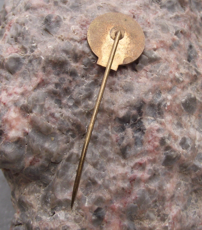 - A gold coloured metal pin badge with a 1.7cm high badge face and a long stick pin style fastener to the rear.