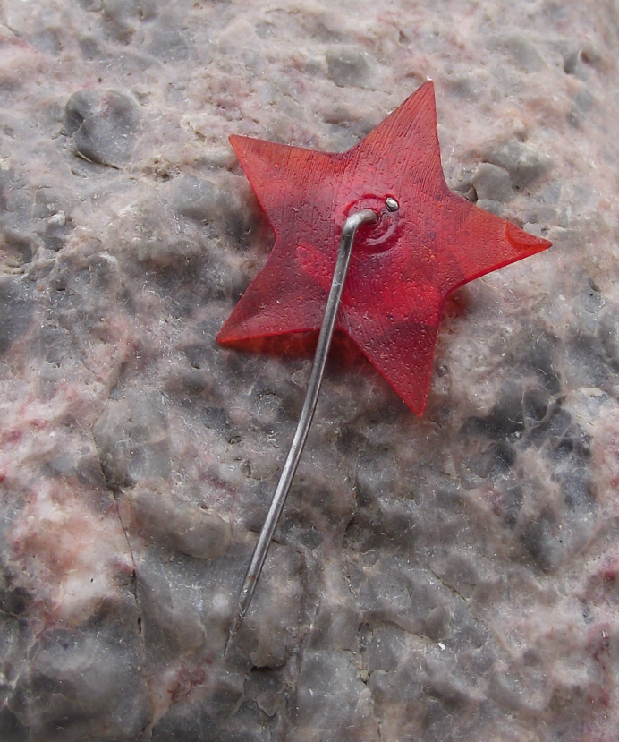 A rare vintage, red and white coloured plastic pin badge with a 2.2cm wide badge face and a long stick pin style fastener to the rear.