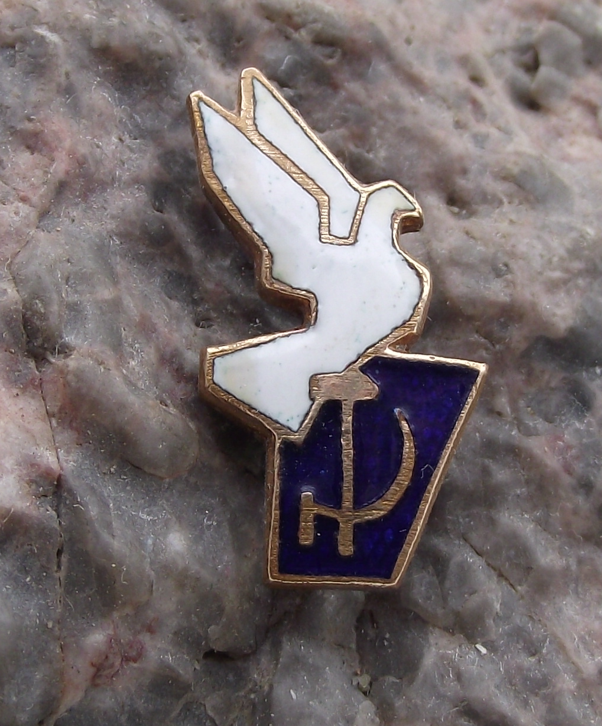 It features a flying white dove above the Soviet Hammer and Sickle motif.