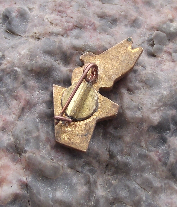A rare vintage, gold coloured metal pin badge with a 2.2cm high badge face and a safety clasp style fastener to the rear.