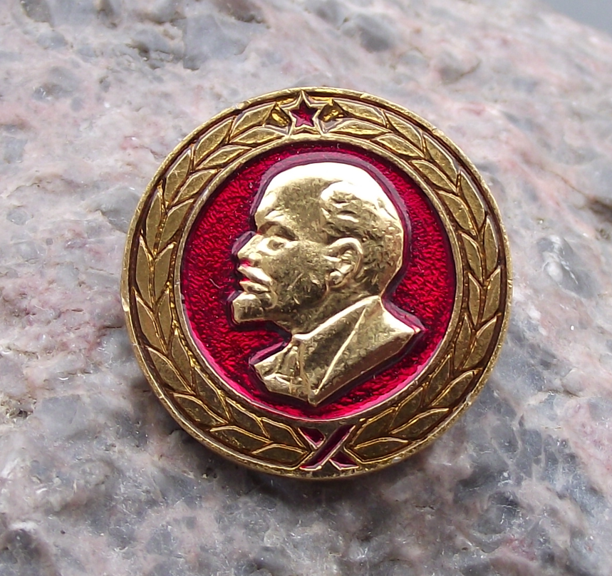 - A pretty, Lenin pin badge, 2.2cm in diameter, made of a gold coloured metal and featuring a superbly detailed golden Lenin. With a safety clasp style fastener to the rear.
