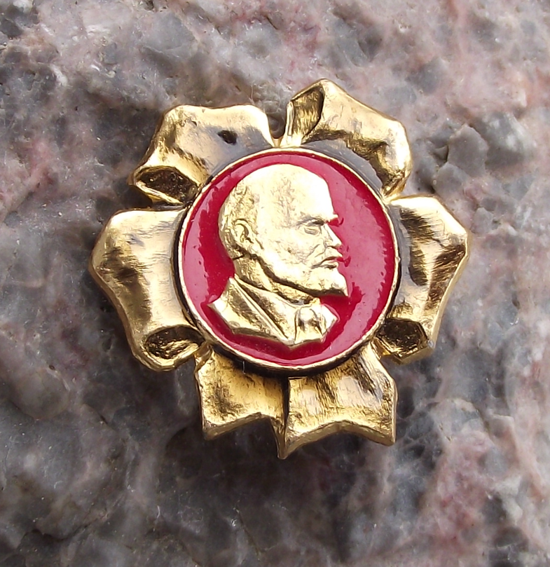 Vintage Soviet Lenin Head on Flower Shaped Ribbon Political Pin Badge