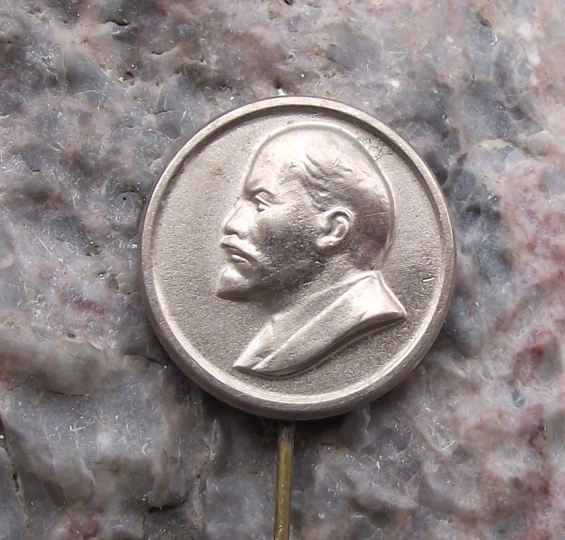 - A pretty, Lenin pin badge, with a 1.7cm diameter badge face, made of a silver coloured metal and featuring a raised relief Lenin. With a long stick pin style fastener to the rear.