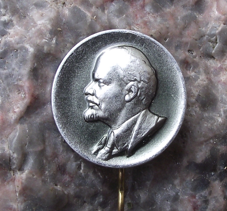 - A pretty, Lenin pin badge, with a 1.7cm diameter badge face, made of a silver coloured metal and featuring a raised relief Lenin. With a long stick pin style fastener to the rear.