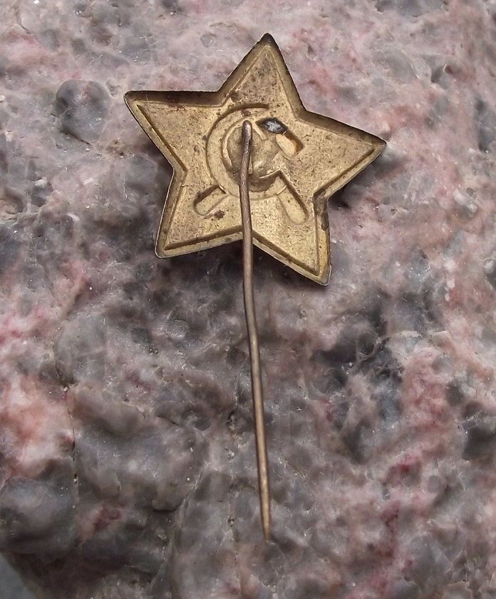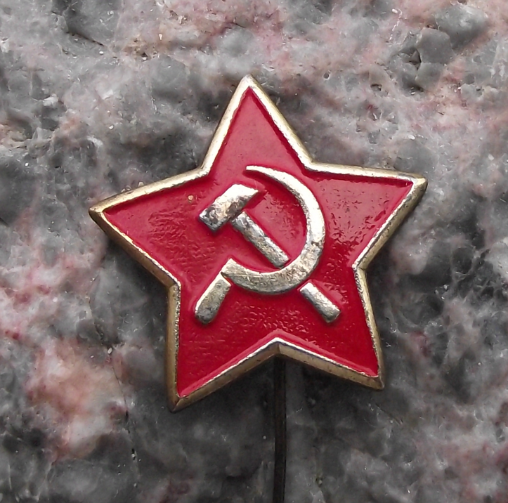 - An old red coloured enamel star on a gold coloured metal die stamped badge face 2.2cm in diameter with a long stick pin fastener to the rear. Featuring the hammer and sickle logo of the former Soviet Union.