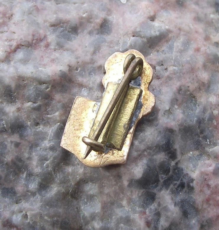 - An pretty, gold coloured metal pin badge. The badge face is 1.5cm high and has a safety clasp style fastener to the rear. Featuring an pair of blue flowers and the words 'Peace' in the Russian language.