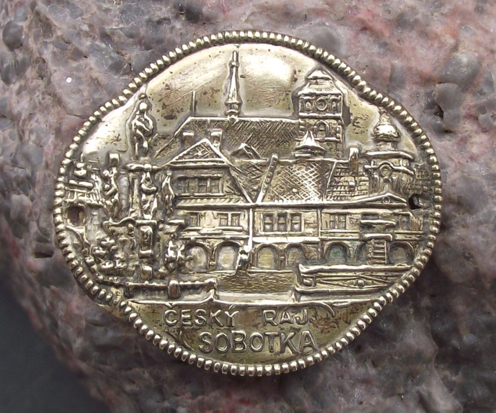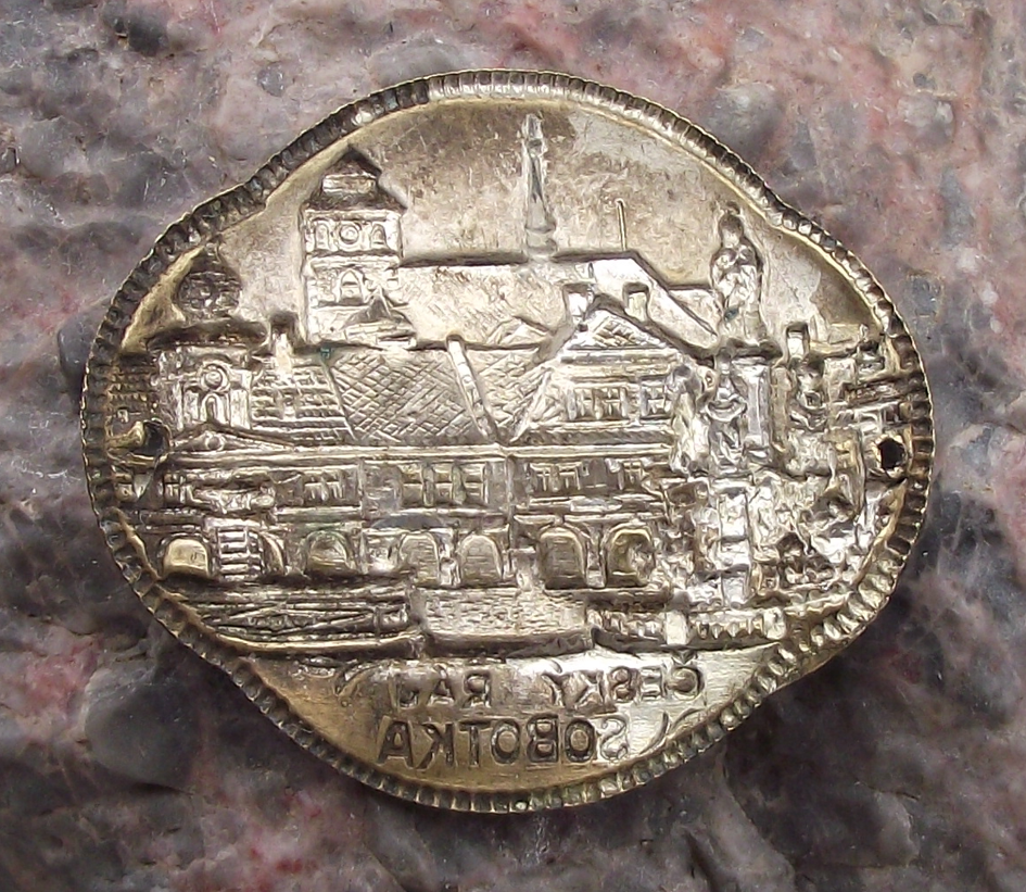 - A vintage silver coloured metal walking stick plate, 3.5cm wide and depicting the town of Sobotka in Cesky Raj