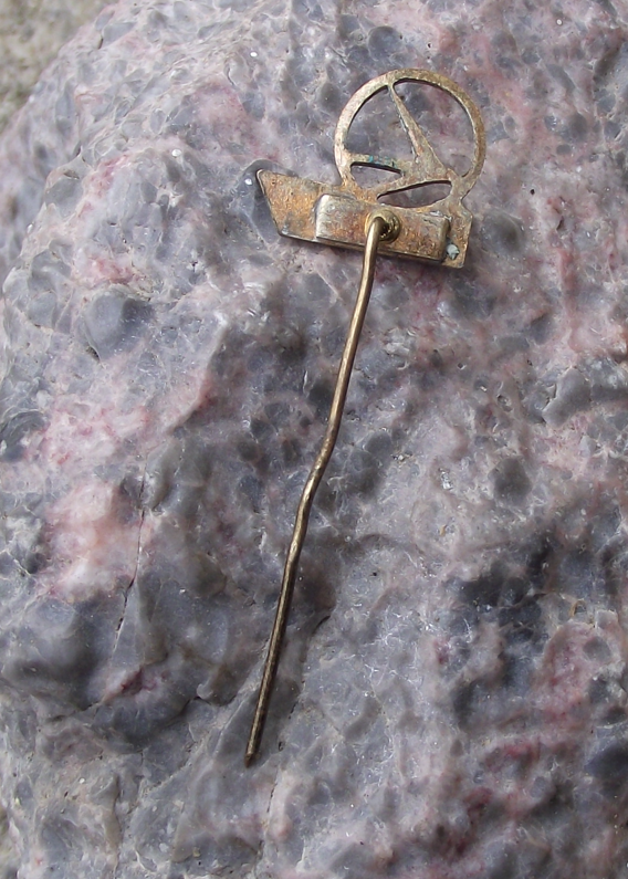 The badge face is 1.6cm wide and has a long, stick pin fastener.